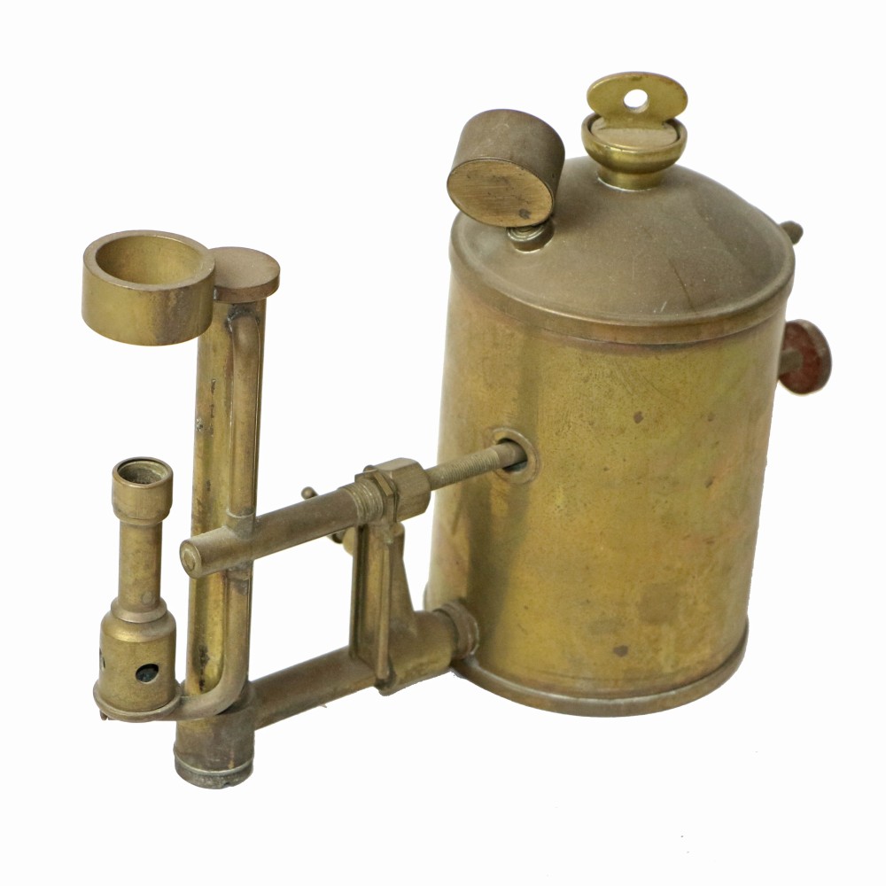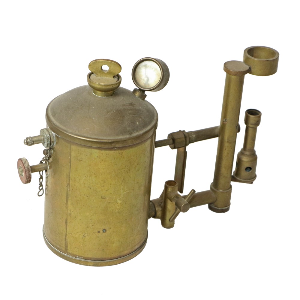 Los generadores de carburo como este fueron ampliamente empleados por fabricantes franceses como E. Mazo, Molteni, Ducretet, Gaumont y Pathé, así como por casas alemanas y británicas dedicadas a la instrumentación óptica.