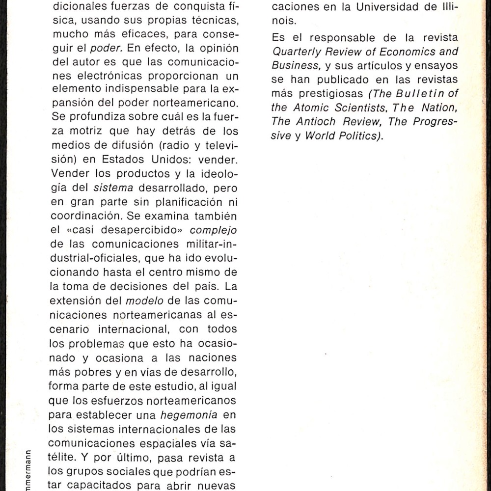 Ensayo fundamental del sociólogo y crítico norteamericano Herbert I. Schiller (1919–2000), figura clave en los estudios sobre comunicación y poder. En esta obra, Schiller analiza cómo los medios de comunicación de masas —radio, televisión y prensa— se han convertido en herramientas centrales de expansión del poder estadounidense, reemplazando a las antiguas formas de dominación militar o territorial.