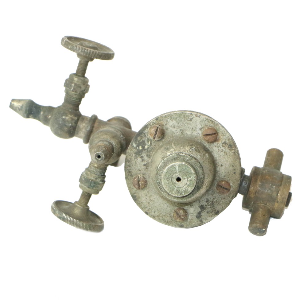 Este dispositivo corresponde a un distribuidor de gas empleado para regular la presión y el flujo de gases combustibles, como oxígeno o acetileno, en sistemas de iluminación o proyección cinematográfica, así como en equipos de laboratorio óptico o físico.