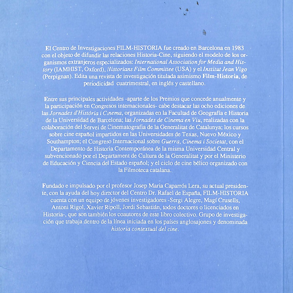 El cine en Cataluña. Una aproximación histórica constituye el primer volumen de la colección Libros “Film-Historia”, editada por el Centro de Investigaciones Film-Historia (Universidad de Barcelona), institución fundada en 1983 y pionera en el estudio de las relaciones entre Historia y Cine en el ámbito académico español.