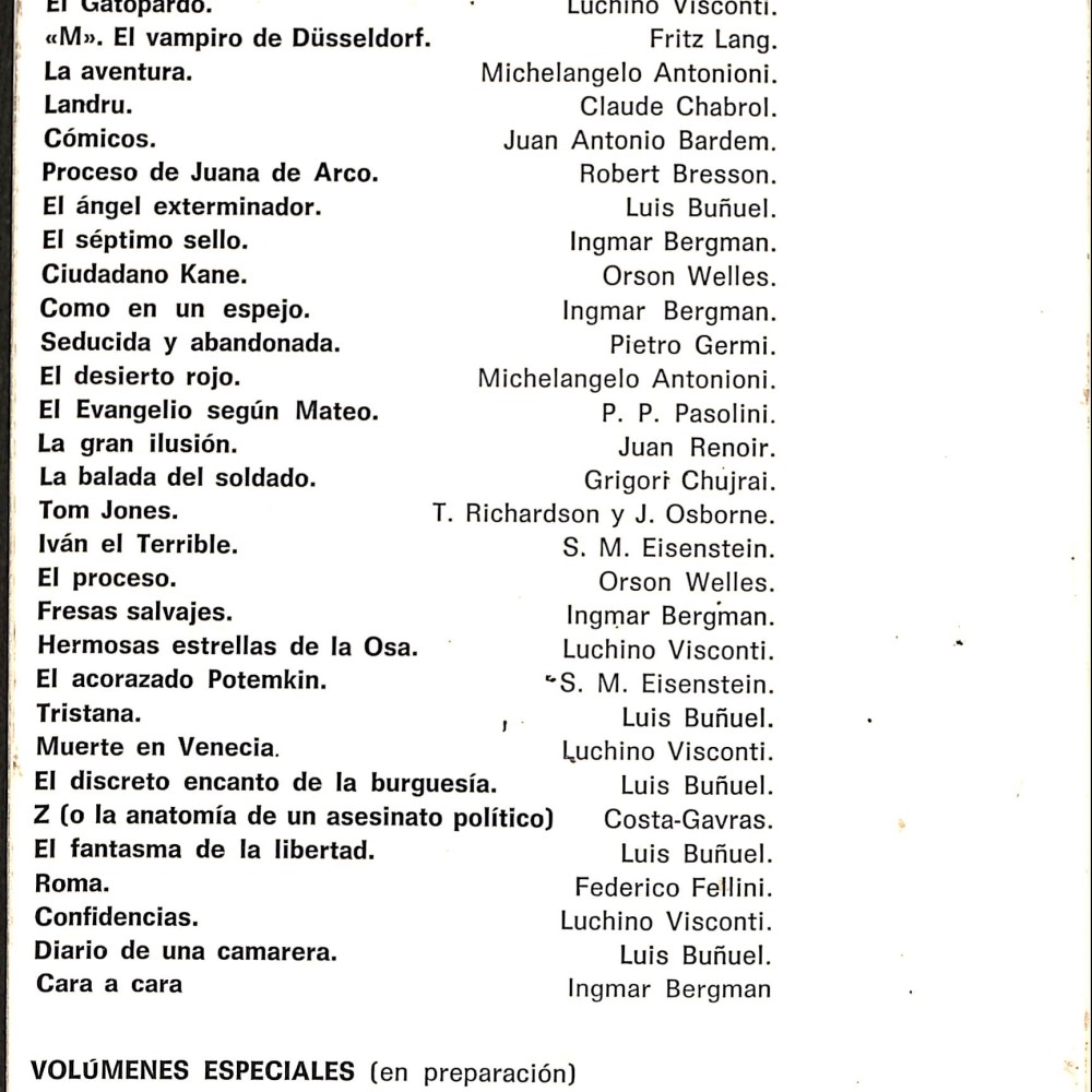 En la contraportada del libro figura un catálogo con otros títulos de la serie Cine, donde aparecen autores fundamentales como Fellini, Buñuel, Antonioni, Visconti, Bergman, Pasolini, Costa-Gavras o Welles, lo que sitúa a este ejemplar dentro de una de las colecciones cinematográficas más completas editadas en lengua española.