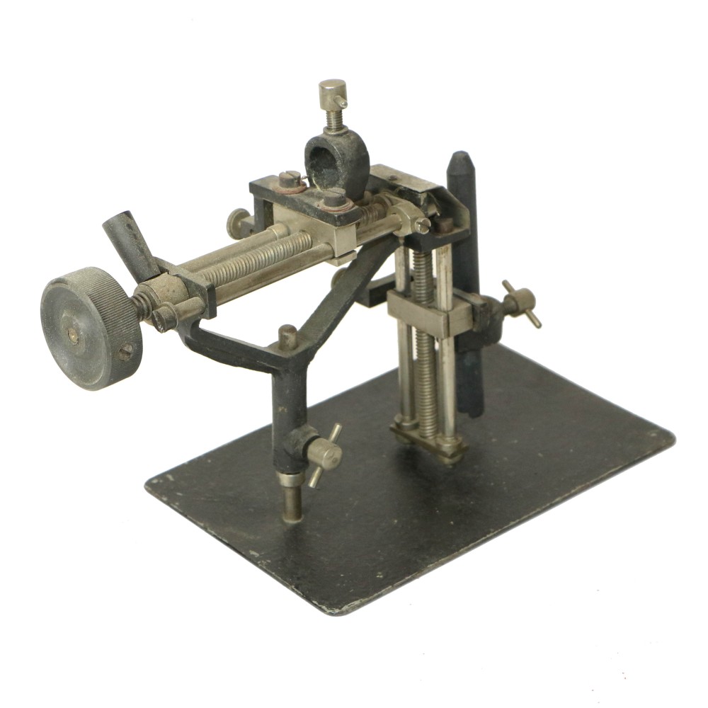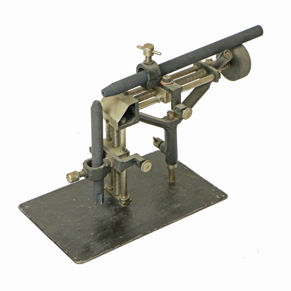 El aparato corresponde a un encendedor de carbón de laboratorio o de proyección, diseñado para generar un arco eléctrico controlado mediante dos barras de carbón que, al ponerse en contacto y separarse, producen una luz blanca intensa.
