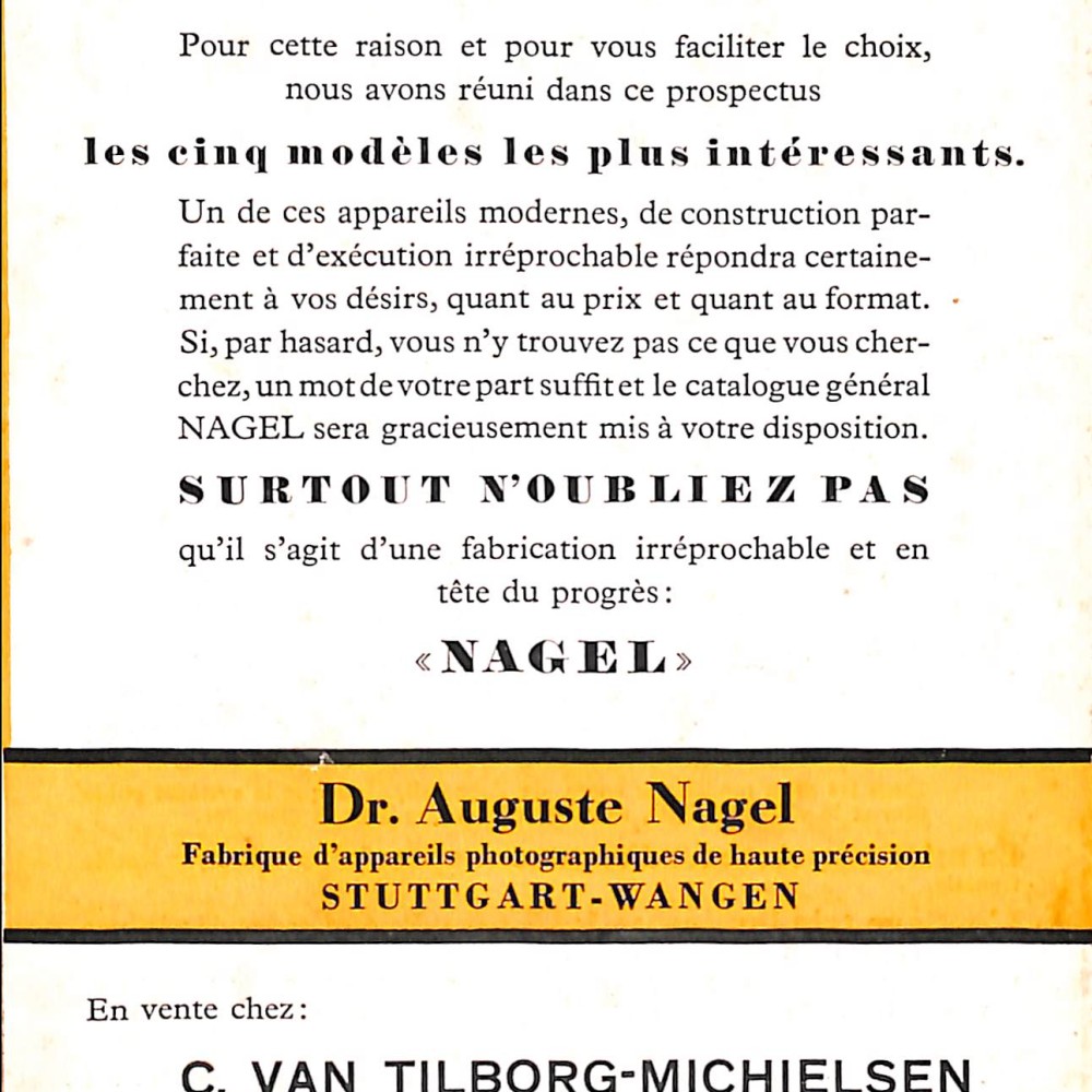 - Este catálogo promociona “Les cinq appareils de Nagel” (los cinco modelos de Nagel) con el objetivo de consolidar la presencia de la marca en el mercado internacional justo antes de la absorción por Kodak.