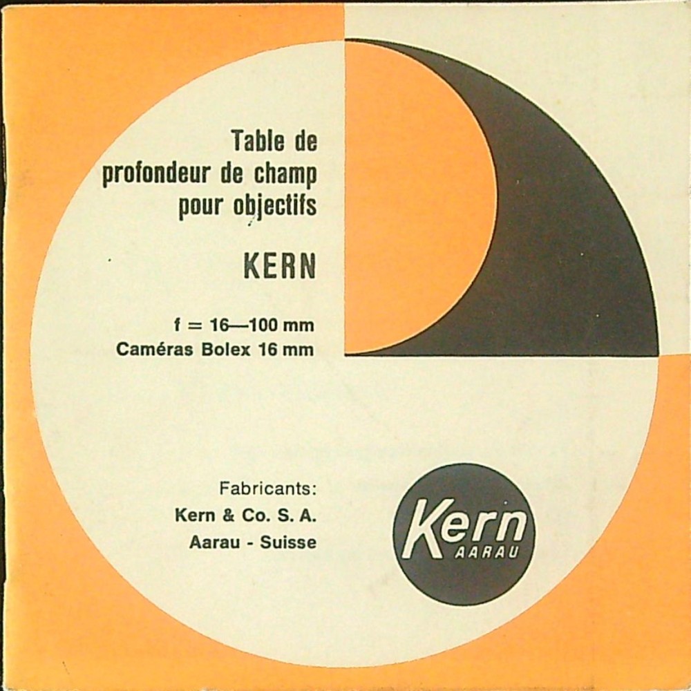 Folleto: : Table de profondeur de champ pour objectifs Kern (f = 16–100 mm) – Caméras Bolex 16 mm