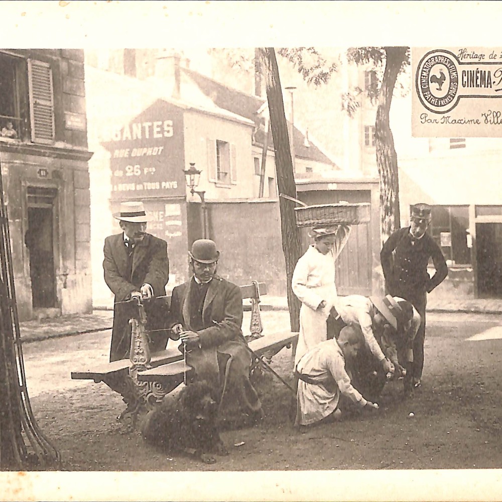 - La escena aquí se sitúa en un entorno urbano, probablemente un barrio popular de París: dos hombres con sombrero cuidan del perro, sentado junto a un banco, mientras alrededor se desarrolla la acción (niños jugando en el suelo, una mujer con cesta, un policía que observa).