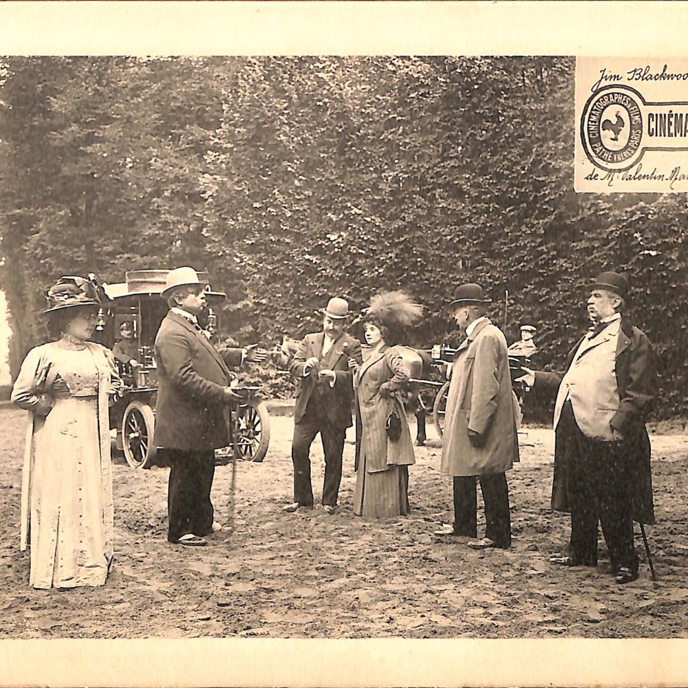 - La escena muestra a varios personajes bien vestidos en un entorno de parque o hipódromo, con carruajes y caballos al fondo. La disposición de los actores (conversación acalorada entre hombres y mujeres) sugiere una intriga social o cómica en torno al personaje “Jim Blackwood”.