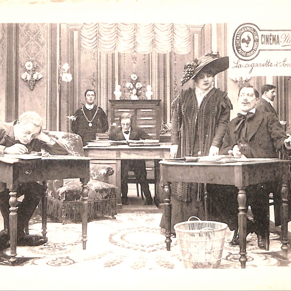 - La escena muestra un espacio burgués o administrativo (posiblemente una oficina notarial o judicial), con personajes caricaturescos en pleno enredo. Este contraste entre lo serio (el entorno) y lo banal (el cigarrillo) era un recurso humorístico muy explotado en la época.