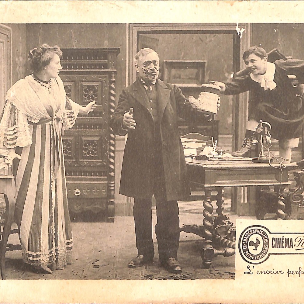 - El argumento giraría en torno a un supuesto “tintero moderno o perfeccionado” que, en lugar de resolver un problema, lo multiplica: en la imagen vemos a un hombre con la cara manchada de tinta, mientras el niño travieso y la mujer reaccionan a la escena.