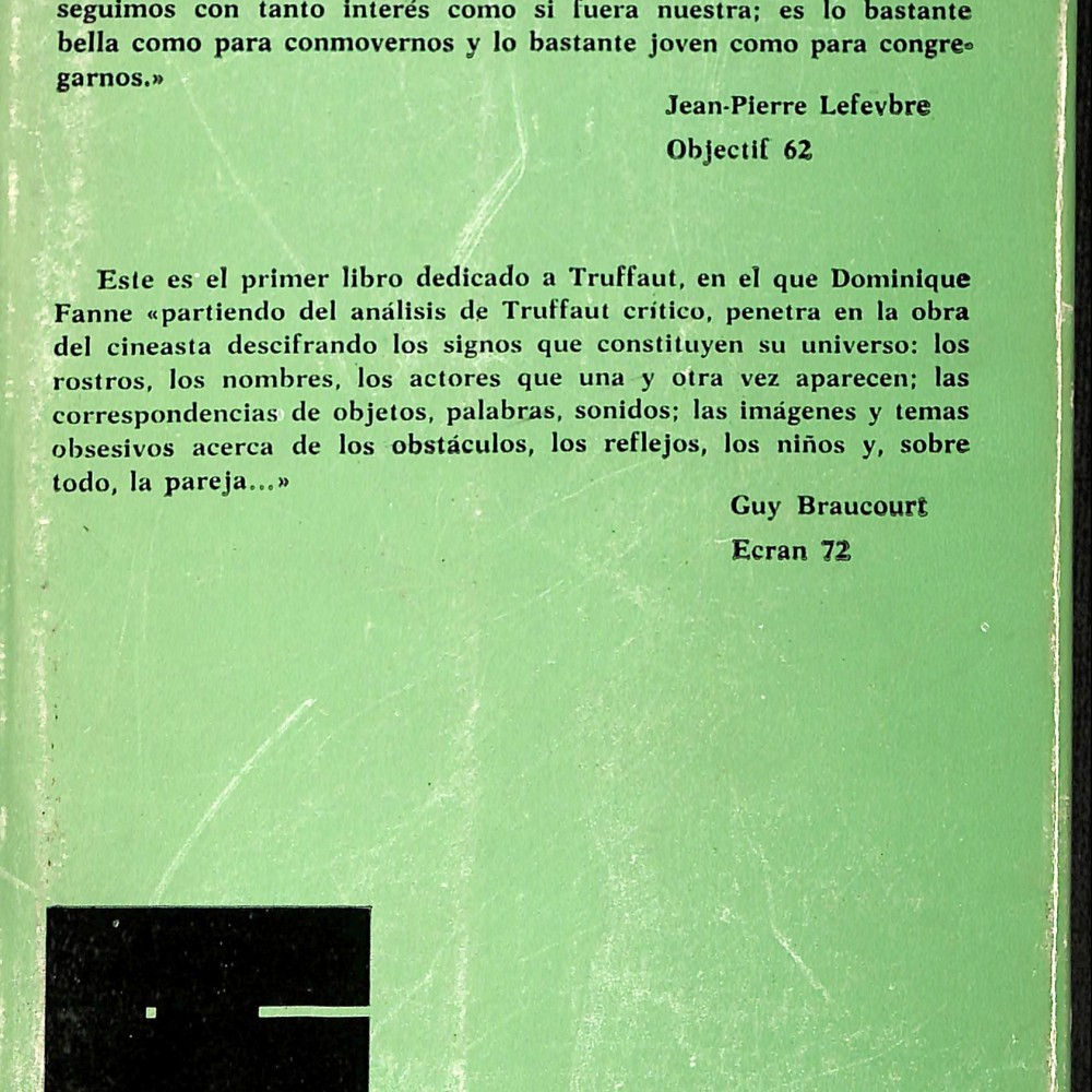 La contraportada incluye comentarios críticos de Jean-Pierre Lefebvre (Objectif 62) y Guy Braucourt (Écran 72), que destacan el carácter joven, apasionado y emocional de la obra de Truffaut, capaz de conmover a una generación entera.