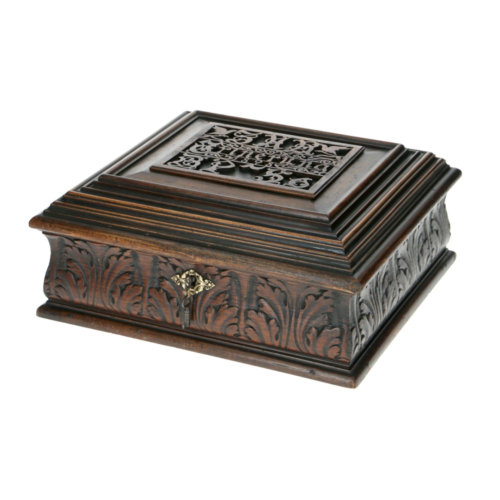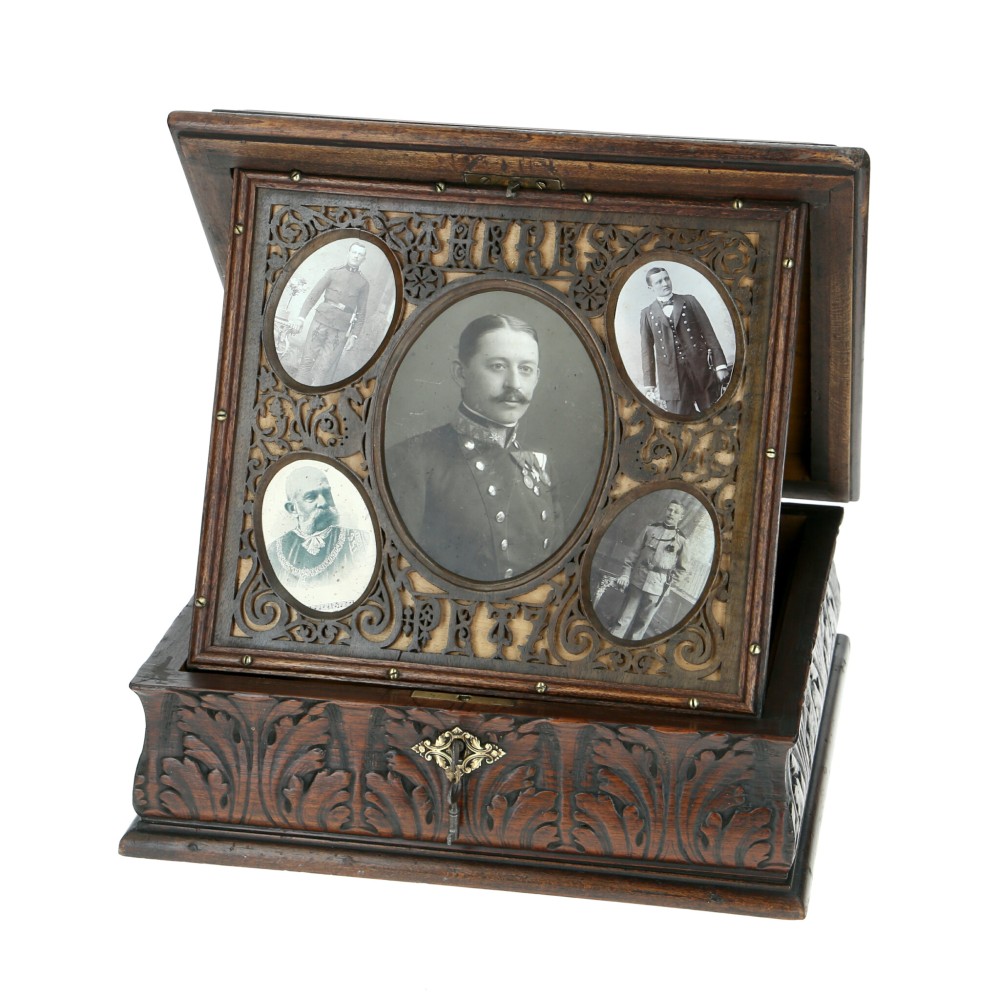 Esta pieza es un híbrido entre mueble decorativo y relicario fotográfico. De madera de roble tallada con motivos ornamentales, bisagras de latón. Se trata de una caja con tapa abatible en forma de atril. En el interior de la tapa tiene un marco con calado decorativo que alberta varios retratos fotográficos de estudio (en formato ovalado y circular). En el interior de la caja cuenta con espacio para guardar más fotografías, postales y recuredos personales