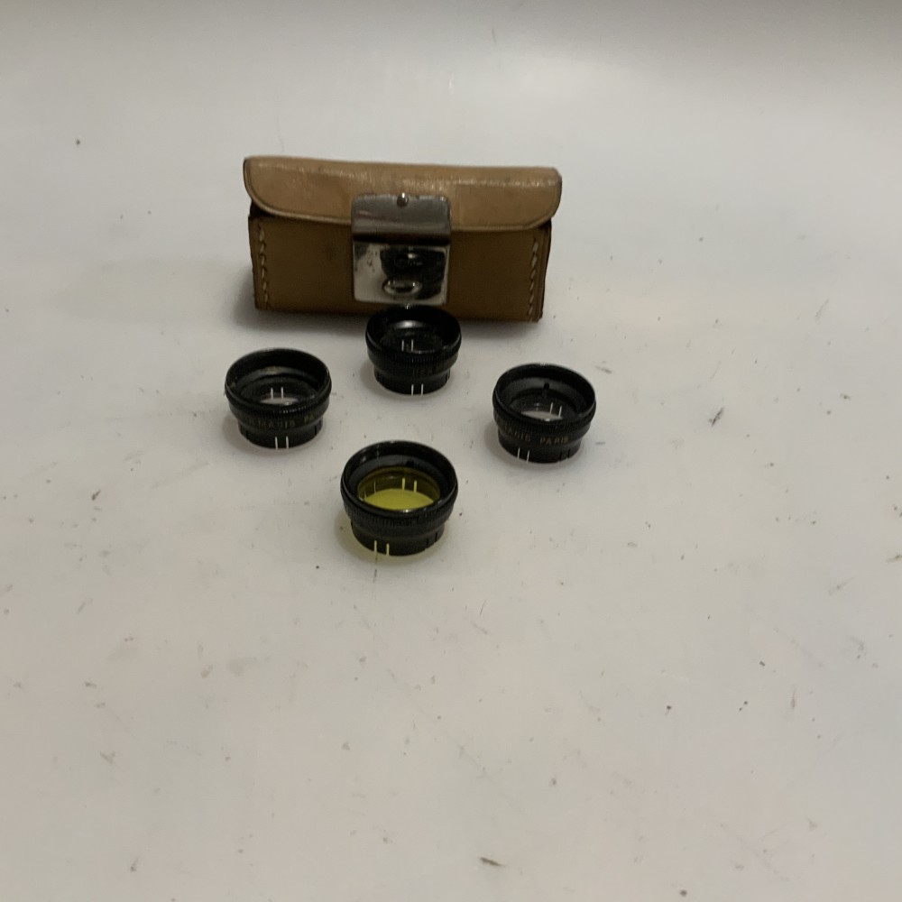 - Estuche: cuero marrón con cierre metálico niquelado, cosido a mano, diseñado para contener cuatro filtros.