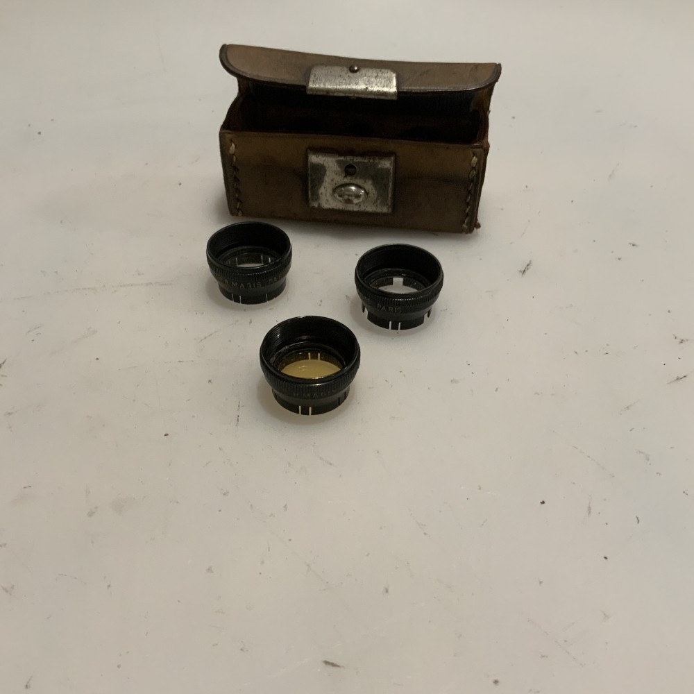 - Estuche: cuero marrón cosido a mano, con cierre a presión niquelado. Interior con compartimentos ajustados para tres filtros.