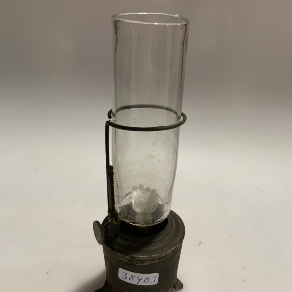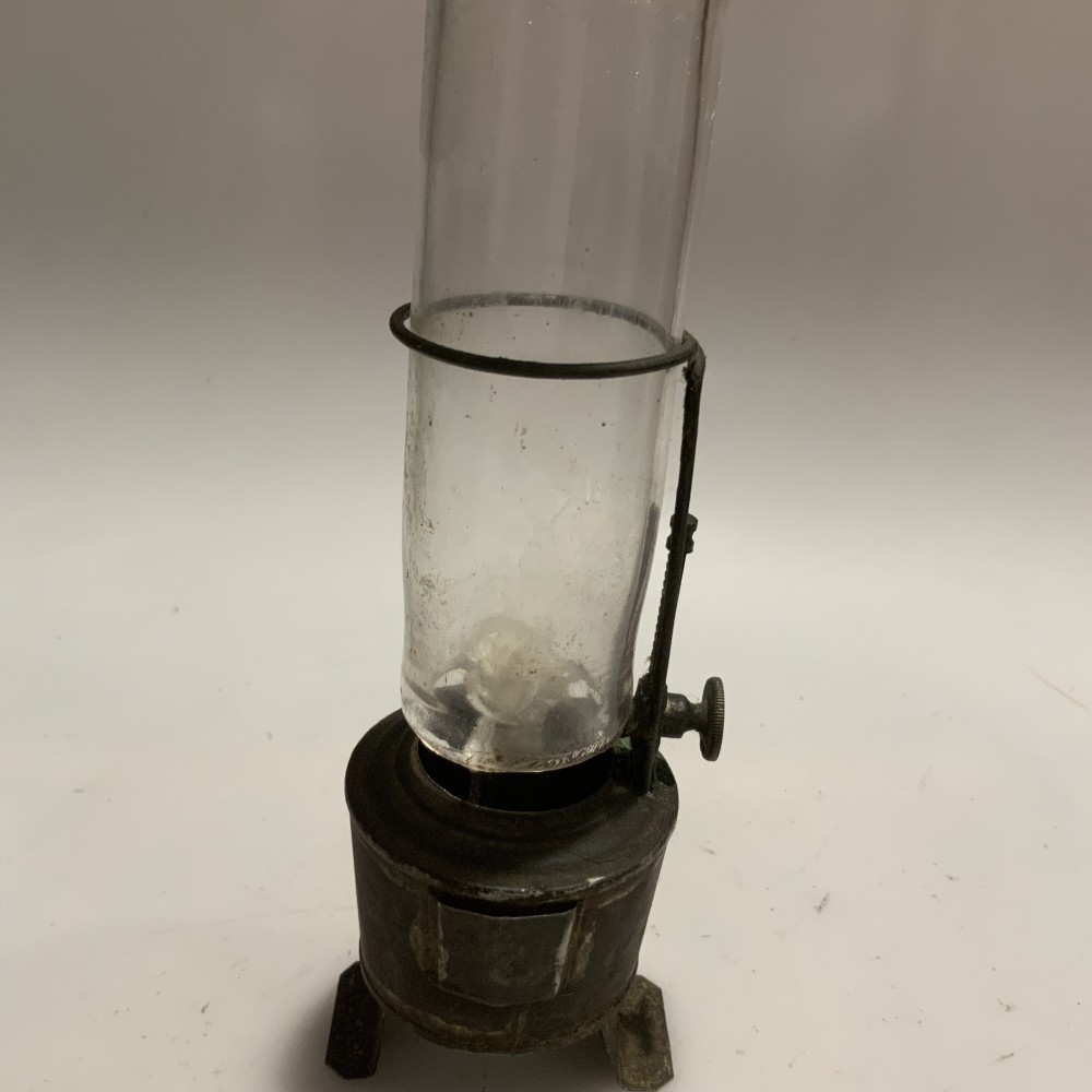 El objeto mostrado es una lámpara de llama abierta con depósito metálico y tubo protector de vidrio, utilizada tradicionalmente en laboratorios fotográficos y cinematográficos.