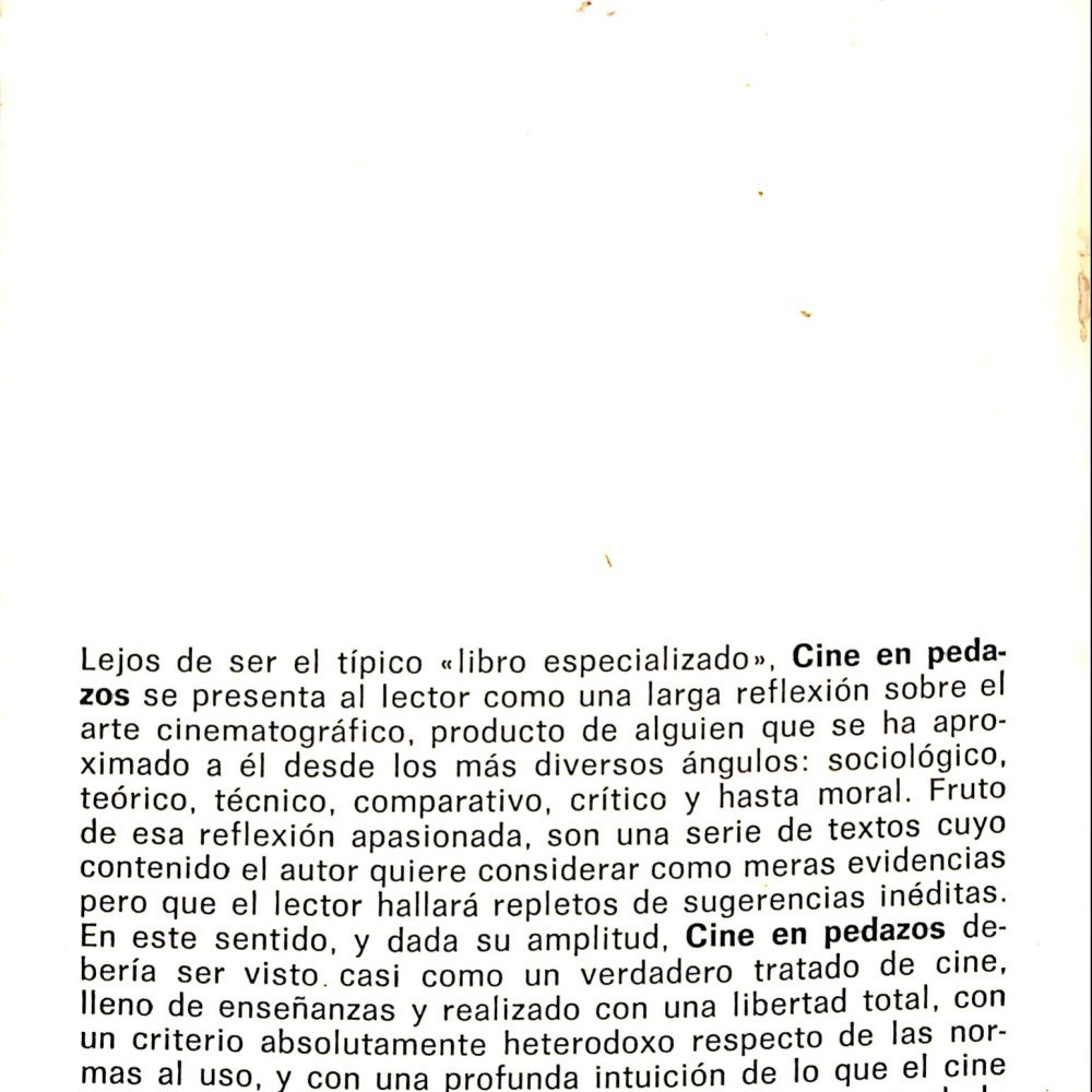 Cine en pedazos es un ensayo crítico que reflexiona sobre el lenguaje cinematográfico desde una perspectiva fragmentaria, poética y filosófica.