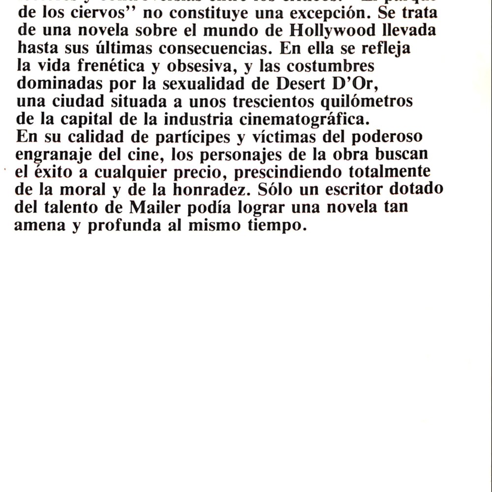 Norman Mailer (1923–2007), figura clave del realismo norteamericano de posguerra, escribió The Deer Park como una alegoría del poder y la hipocresía del sistema de Hollywood. Ambientada en una base militar reconvertida en una ciudad ficticia del desierto californiano, la novela expone el cruce entre sexo, dinero, fama y manipulación, que Mailer observó de cerca durante su paso por el entorno cinematográfico.