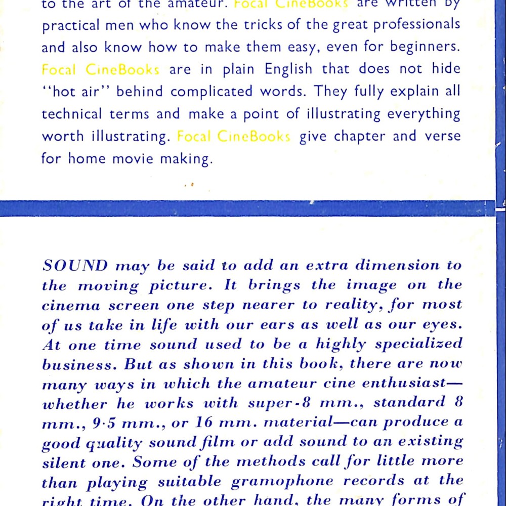 Temática: manual para cineastas amateurs sobre técnicas de grabación y sincronización de sonido en películas de 8 mm, Super 8, 9.5 mm y 16 mm. Incluye explicaciones sobre equipos, micrófonos, grabadoras, sincronización de imagen y sonido, edición y mezcla.