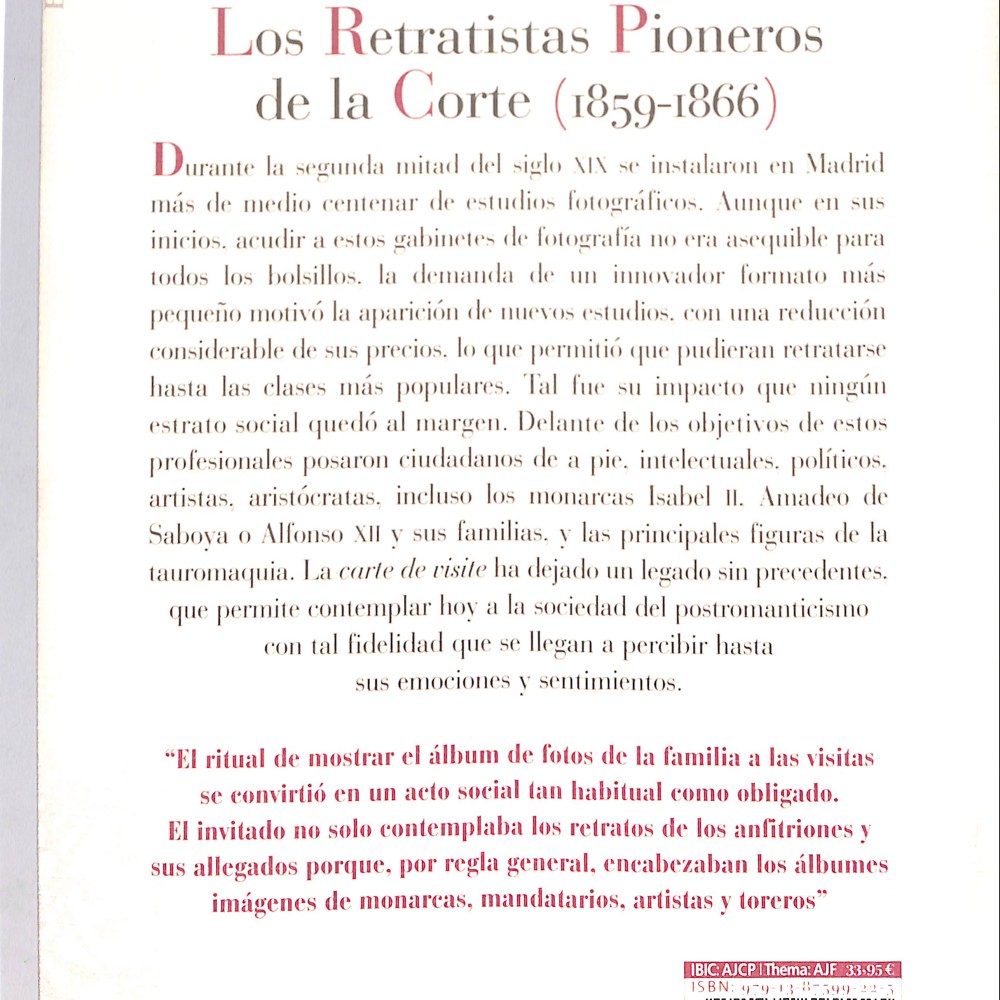 Este libro se centra en los primeros fotógrafos retratistas de la Corte española, en un periodo decisivo: los años en que la fotografía pasa de ser un experimento técnico a consolidarse como práctica artística y documento social.