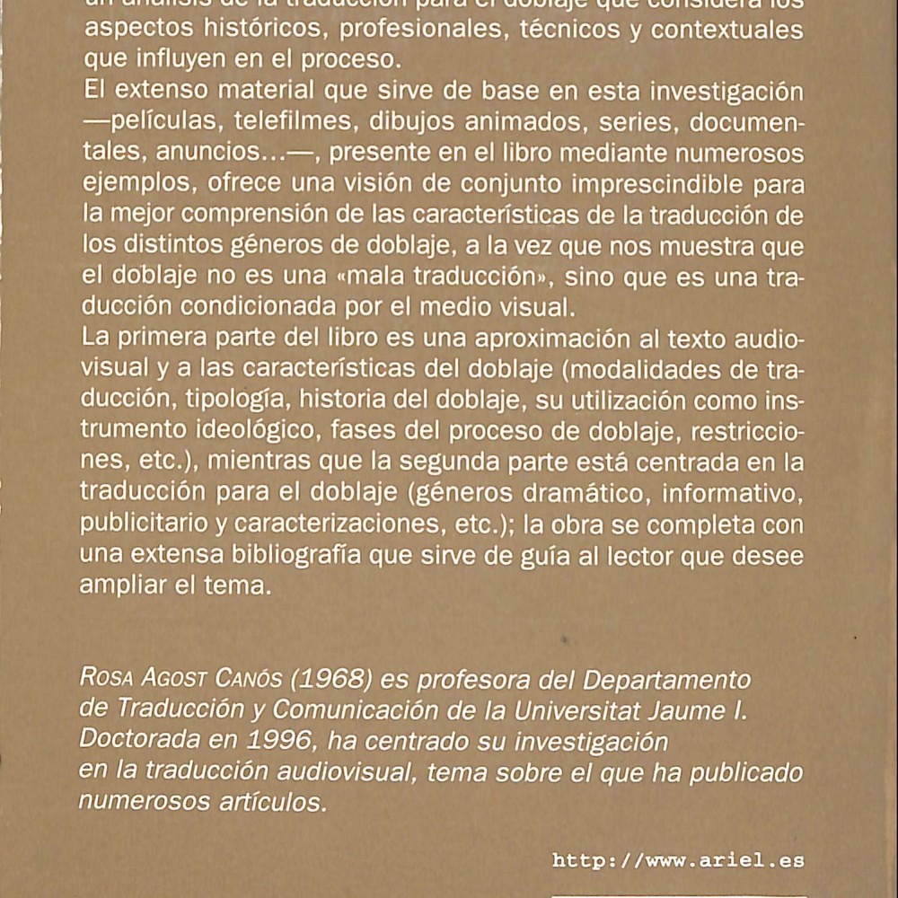 La autora, Rosa Agost, es profesora e investigadora especializada en traducción audiovisual y estudios del doblaje. Este libro, editado por Ariel dentro de su serie de manuales universitarios, se considera una obra pionera en el ámbito hispanohablante sobre la teoría y práctica del doblaje cinematográfico y televisivo.