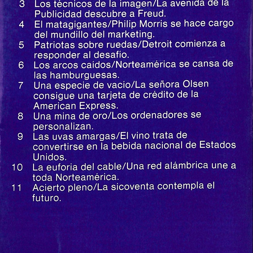 El contenido se organiza en once capítulos que funcionan como estudios de caso, desde la relación entre psicología y marketing (La publicidad descubre a Freud) hasta el auge de los medios de comunicación y el cable en los años 80.
