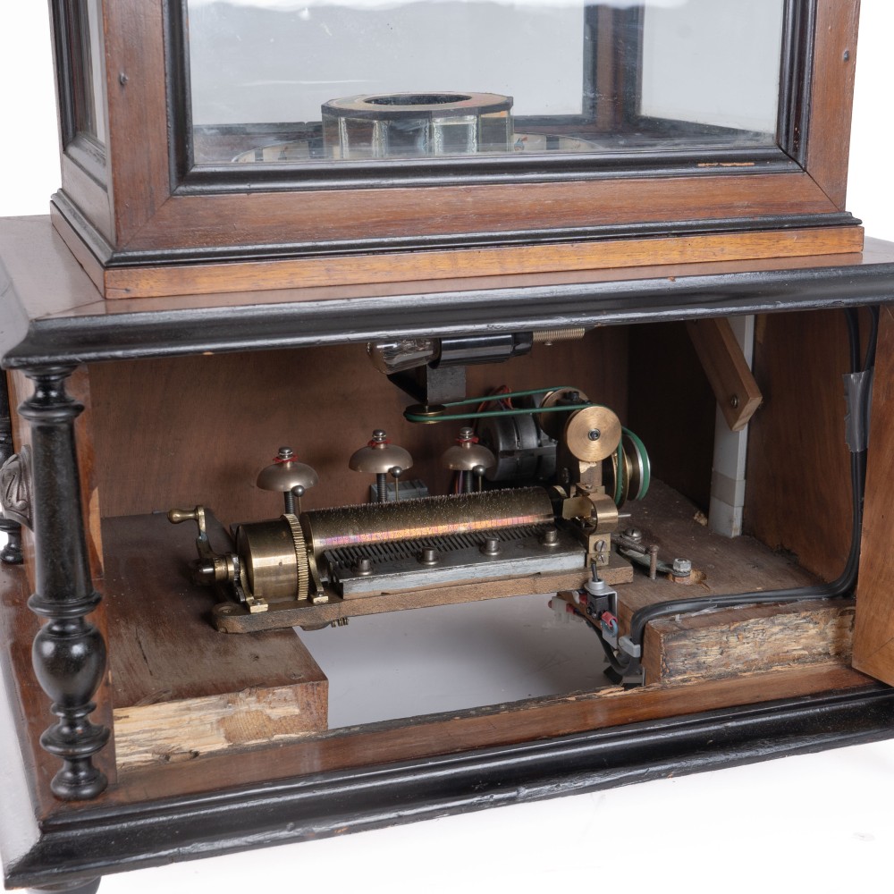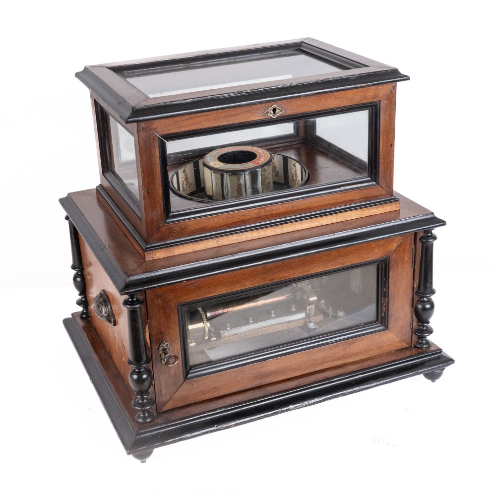 El praxinoscopio que observamos en la fotografia superior incorpora en su base una caja de música que acompaña la secuencia de imágenes observadas.