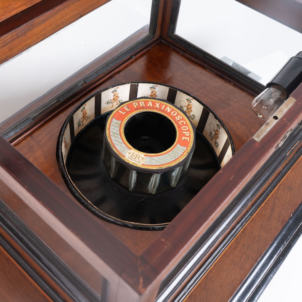 El praxinoscopio uno de los aparatos que colaboraron activamente en los avances tecnológicos cinematográficos. Podríamos decir que fue una elaboración mejorada del zootropo. Su inventor, el francés Charles Émile Reynaud en el año 1877, sustituyó las molestas ranuras del zootropo por un prisma central con espejos sobre los que se reflejaban los dibujos impresos en las tiras de papel, dando la sensación de un movimiento menos brusco, más armónico y con más luminosidad que el zootropo.