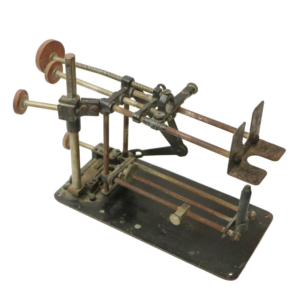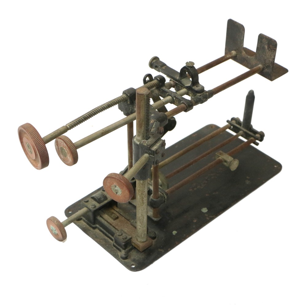 En proyección cinematográfica primitiva, un dispositivo como este permitía al operador alinear la llama del quemador con el eje óptico del proyector, garantizando uniformidad en la iluminación de la pantalla.