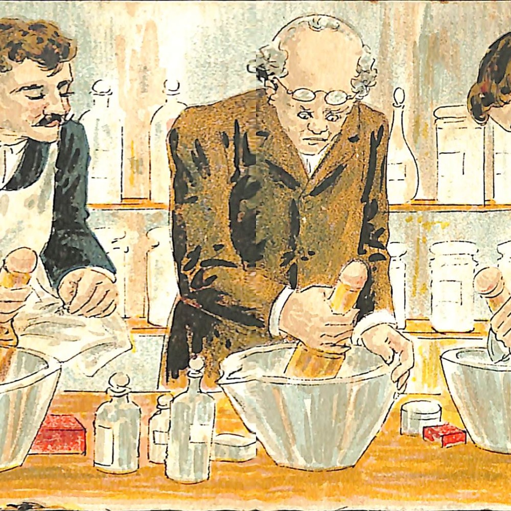 Coloreado en tonos pastel, con leyenda humorística impresa en tipografía de época.