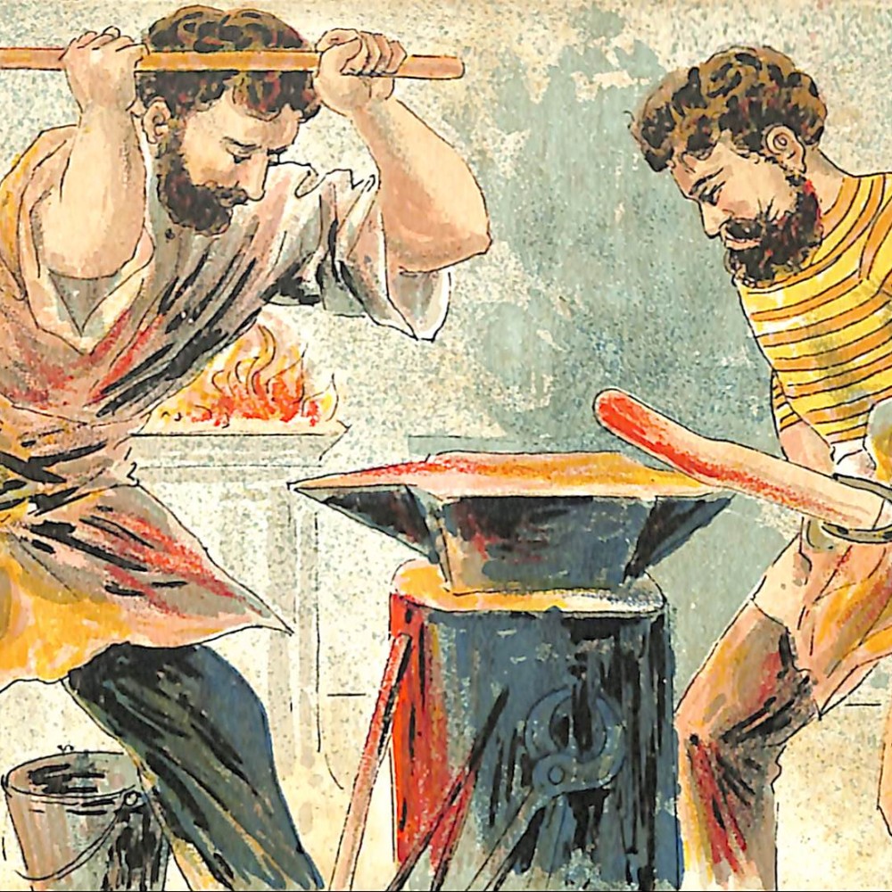 Coloreado en tonos pastel, con leyenda humorística impresa en tipografía de época.