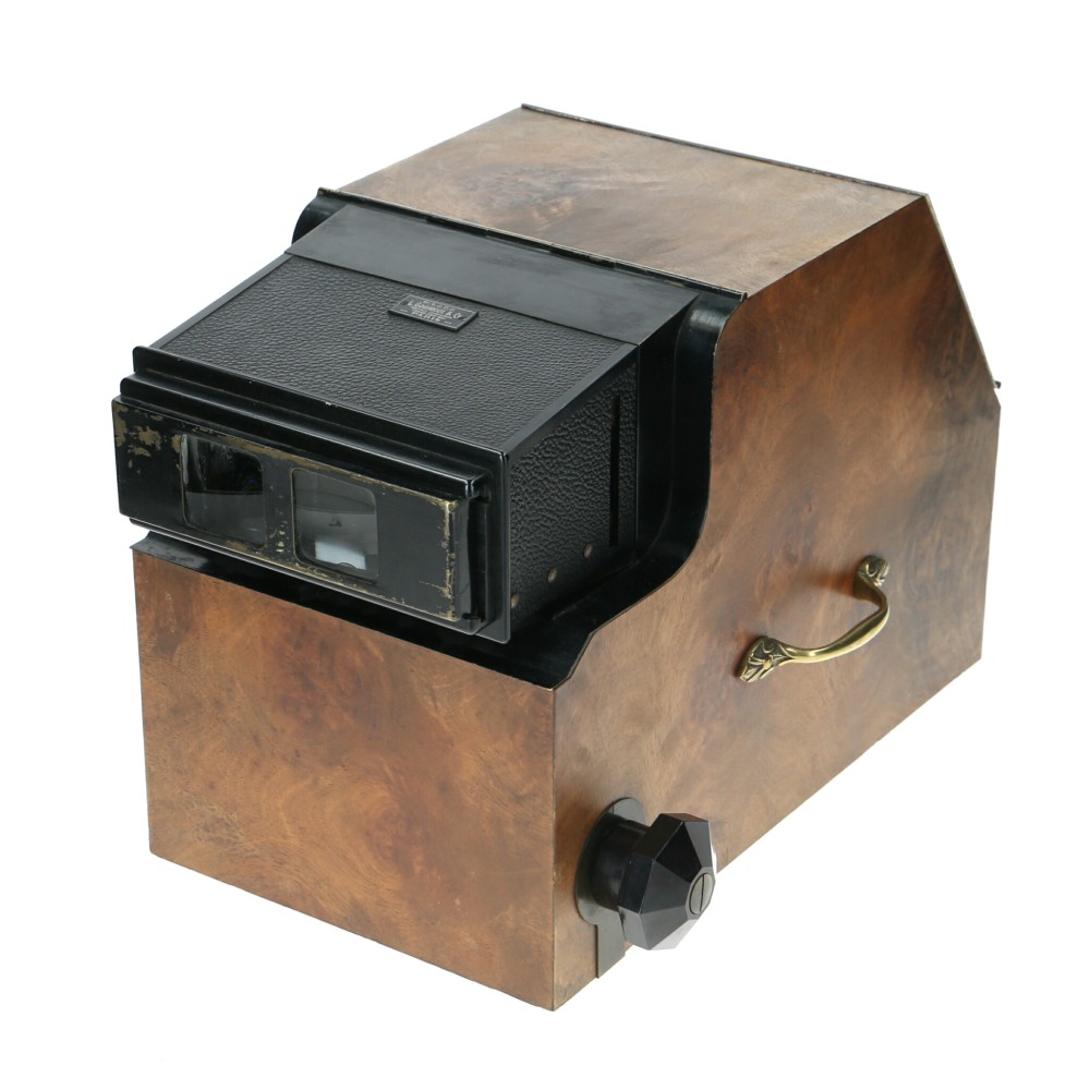 Este sofisticado visor estereoscópico de sobremesa integra una óptica binocular Gaumont (derivada de la Stereo Jumelle) en una caja de madera con un mecanismo de transporte automático para magazines de 24 vistas.