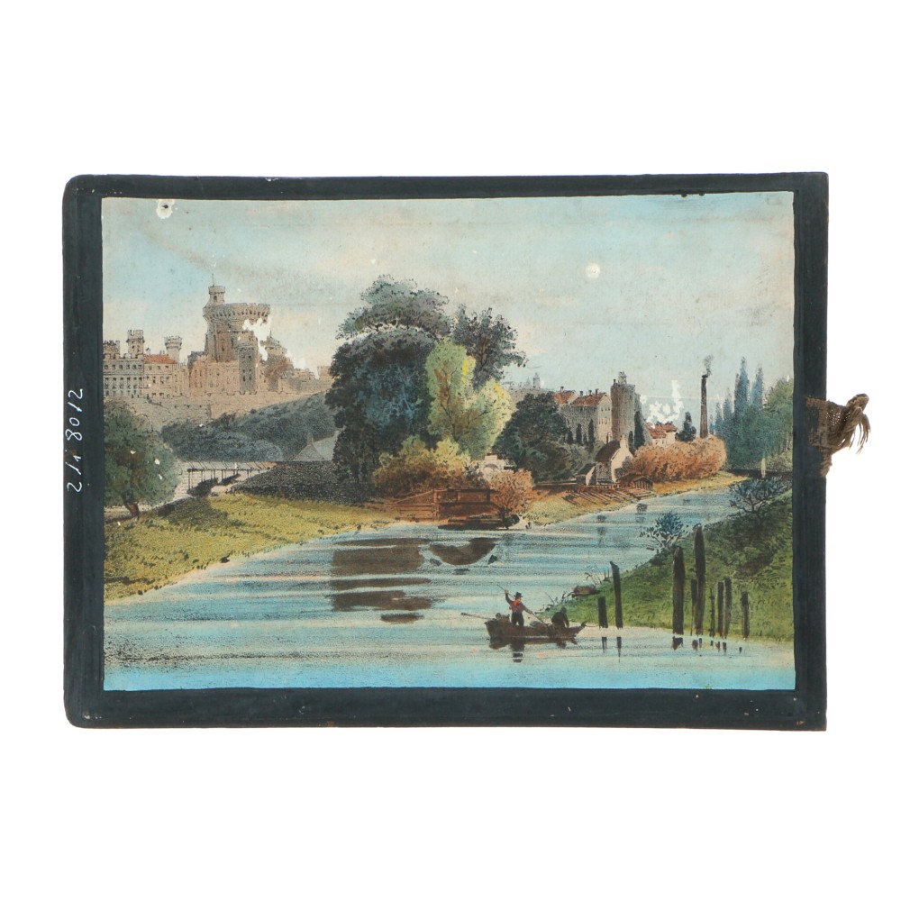 Vista coloreada representando un paisaje fluvial con castillo y poblado al fondo, escenas típicas para visores ópticos.
